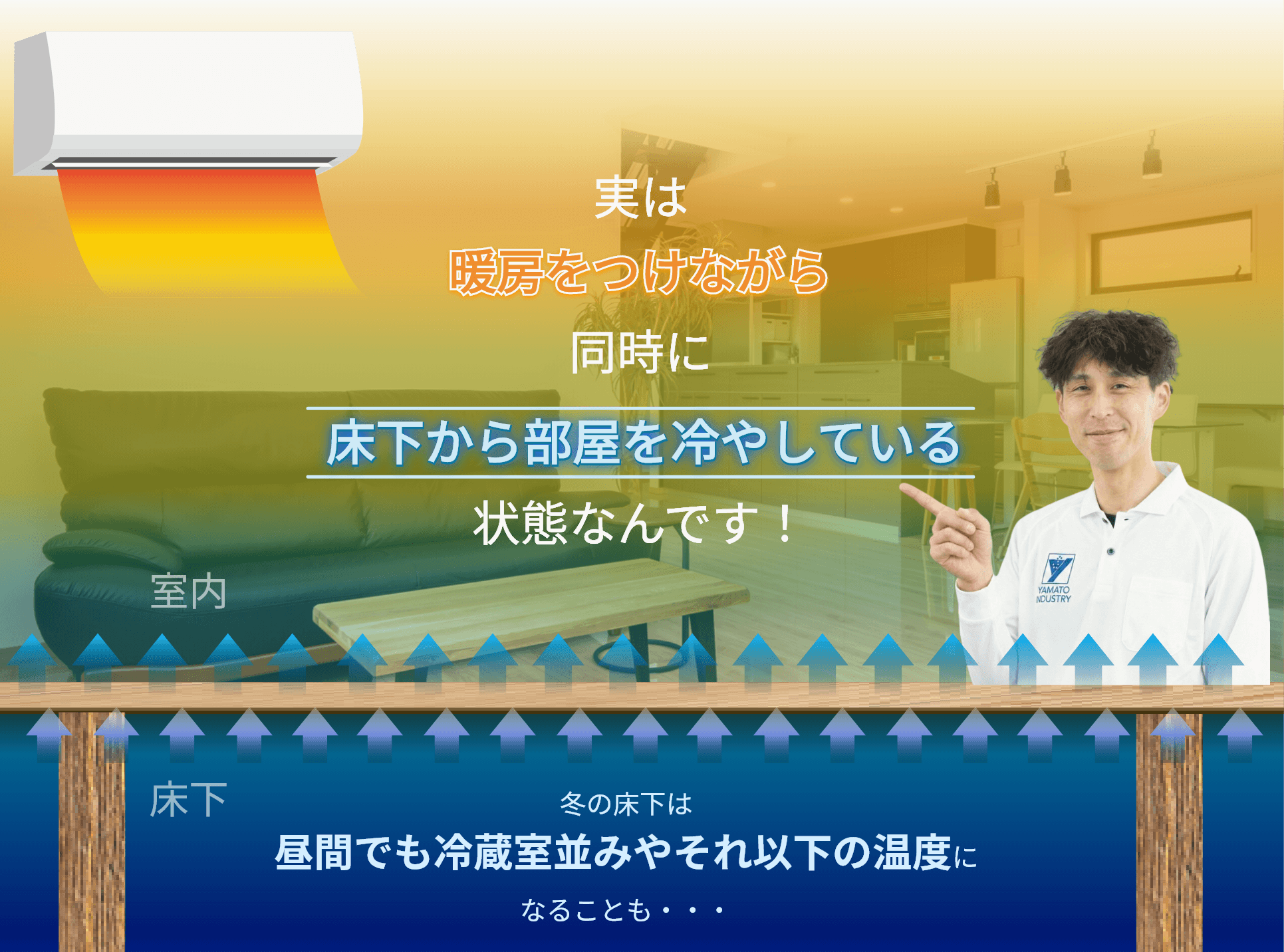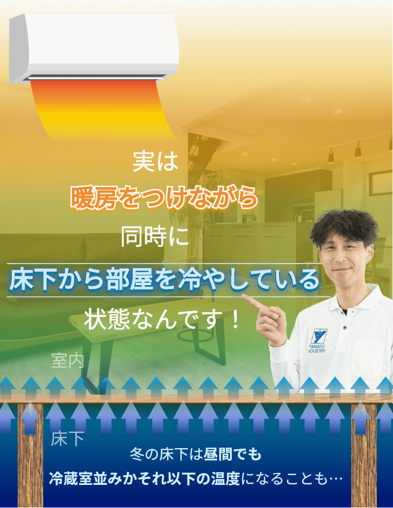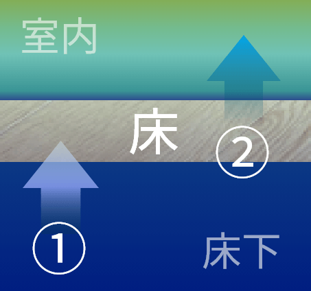①外から流れ込む床下の冷たい空気が、床をどんどん冷やします。